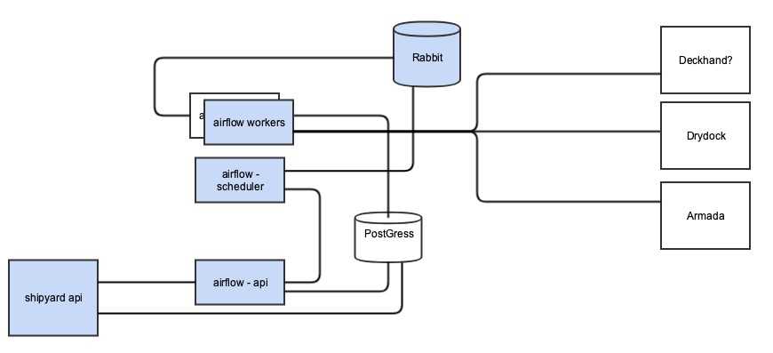 Shipyard provides a frontend API within Airship environments that allow users to push their declared documents into sites and execute pre-defined Directed Acyclic Graphs (DAGs) against those declarations. DAG is a directed graph data structure for topological ordering. From an architectural perspective, this is what Shipyard looks like today and how it interacts with other Airship components: